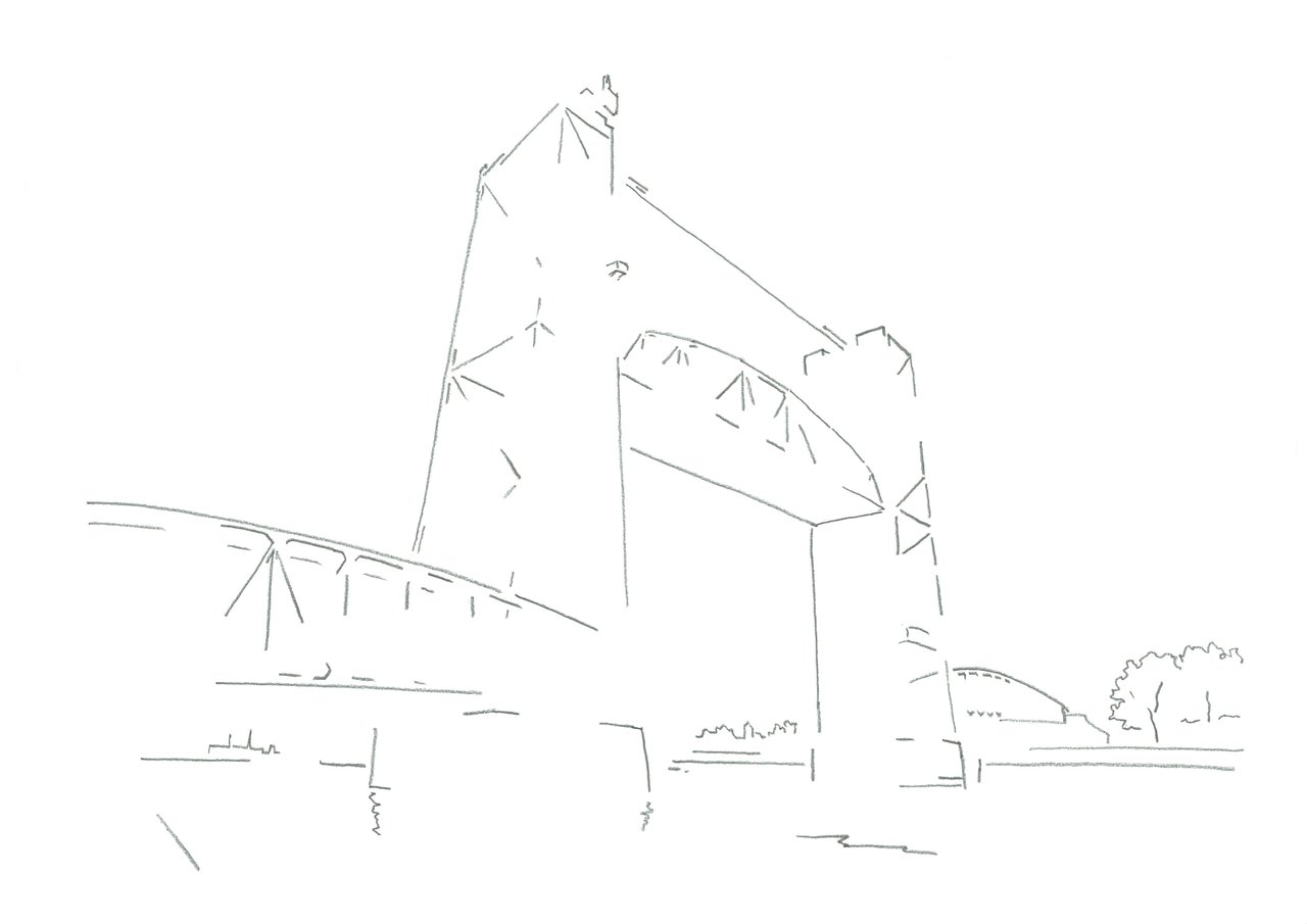 Lijntekening van de spoorbrug De Hef over de Maas in Rotterdam.