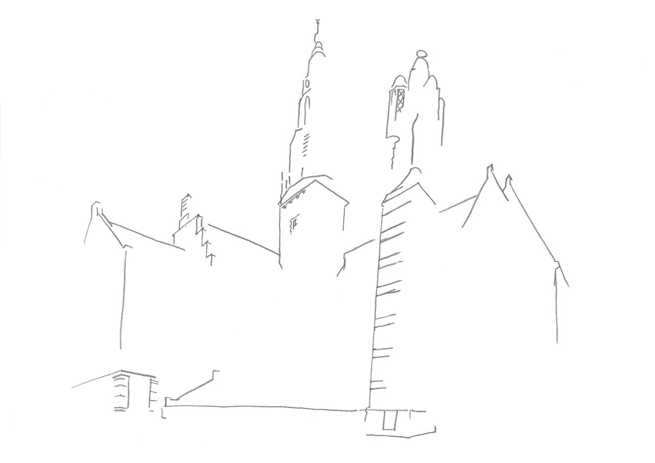 Minimalistische tekening van het stadhuis van Leiden, gezien van het Stadhuisplein.