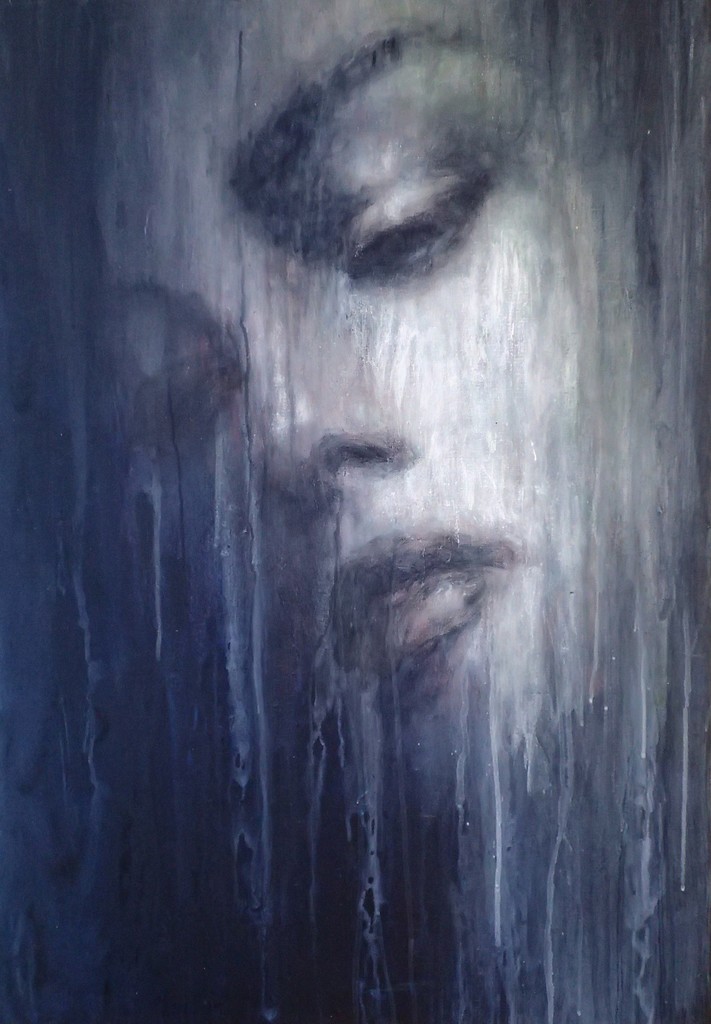 Schilderij Acryl Mysterieus Vrouw Portret Geabstraheerd Gezicht Doek Donker Romantisch Druppels Draden