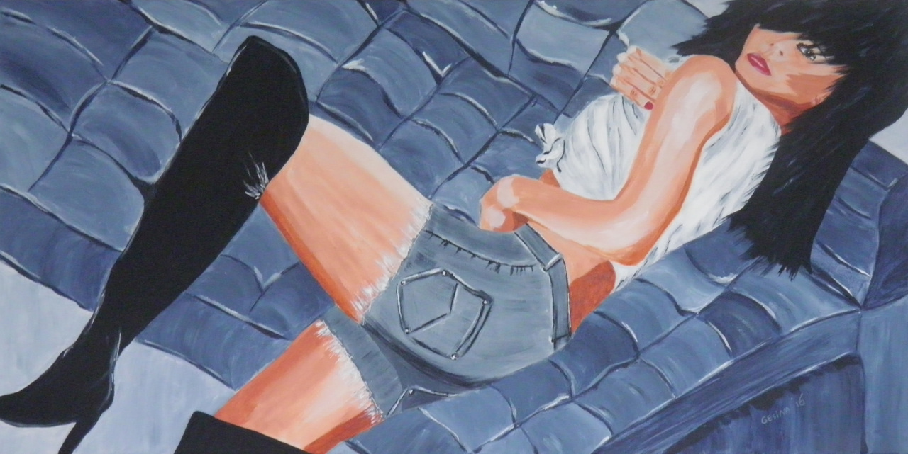 Vrouw Blauw Zwart Gea Gesina Vermeer Schilderij Bank Korte Broek Bloesje Laarzen