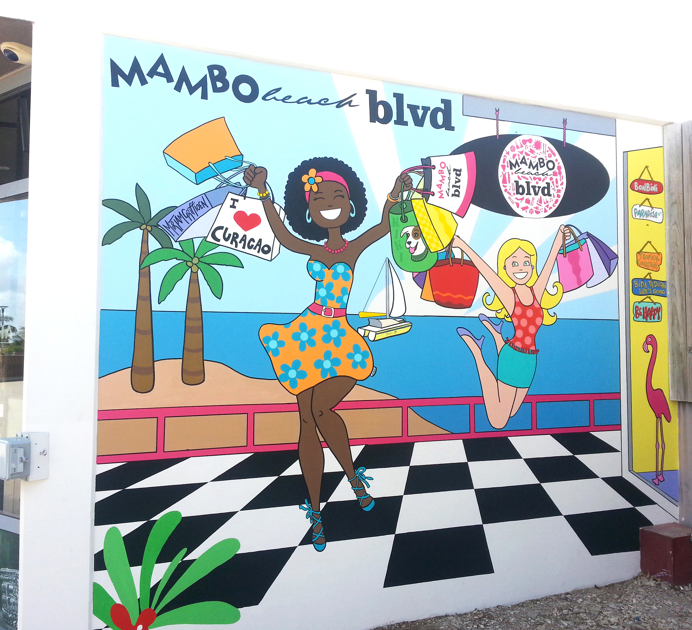 Mambo Beach BLVD, gezellig winkelen, deze vrolijke muurschildering met zeezicht heb ik gemaakt bij de grote ingang van de mambo beach blvd. Een super lokatie op het eiland met veel gezellige restaurantjes en winkeltjes en een heerlijk strand.