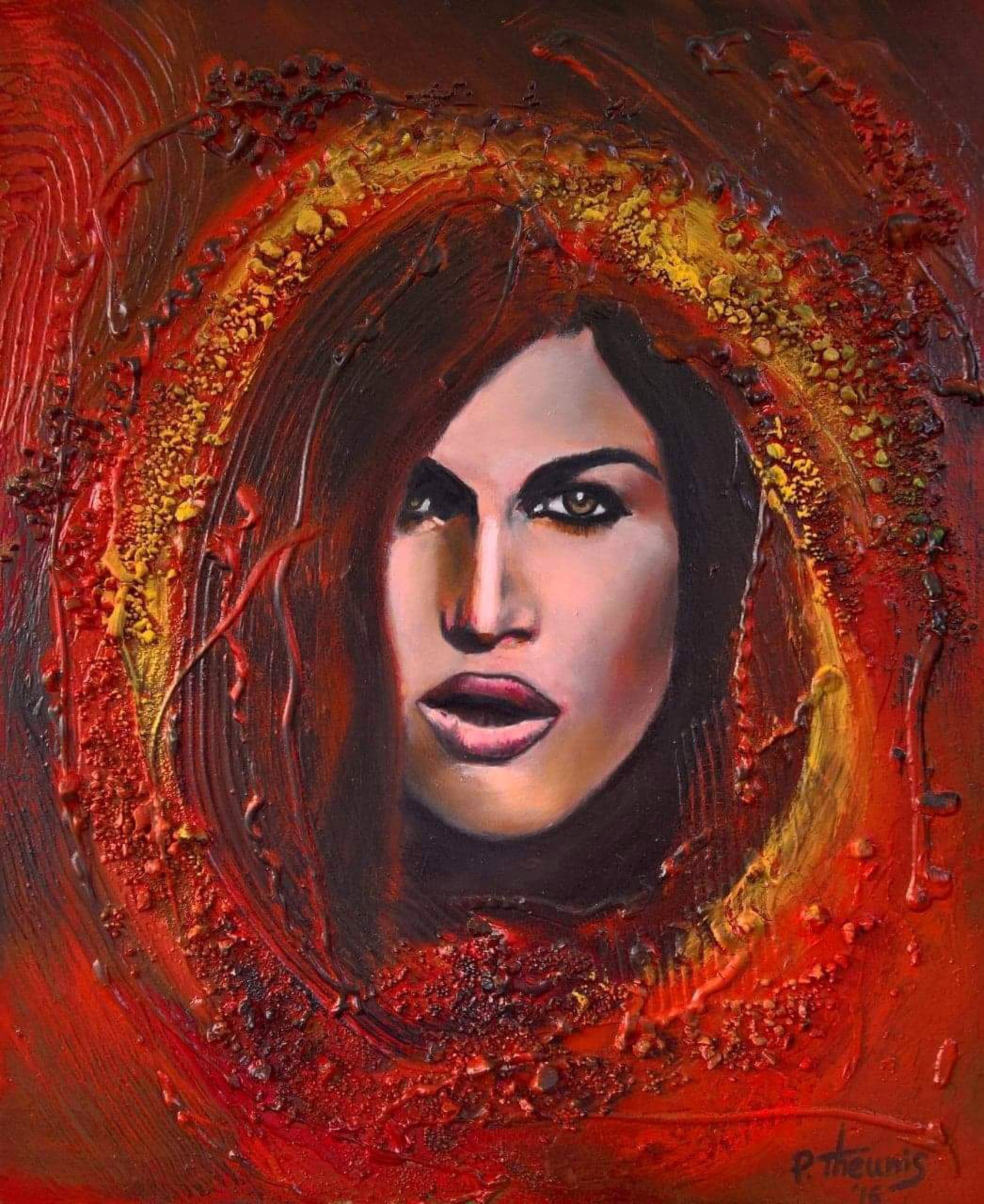 Rood Geel Zwart Portret Mixed Media Olieverf Chaos Steentjes België