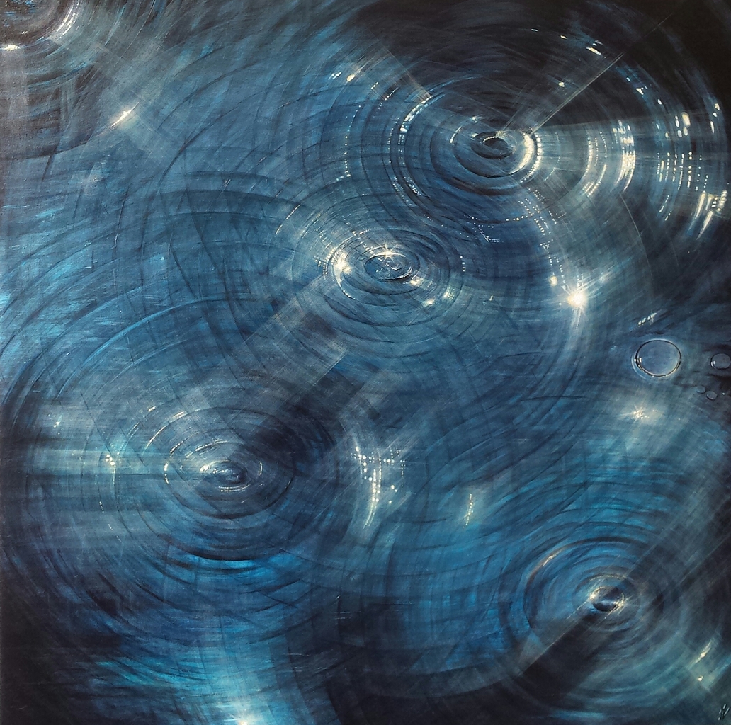 Het ritmische spel van waterkringen en lichtval in de nacht.