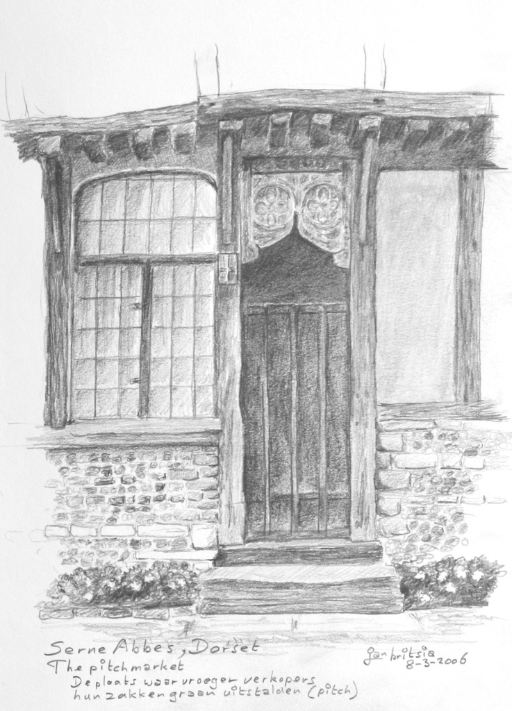 Voor deze oude gevel in het plaatsje Serne Abbes in het district Dorcet, werd lang geleden het graan uitgestald voor de verkoop. Je kunt er in alle rust tekenen.