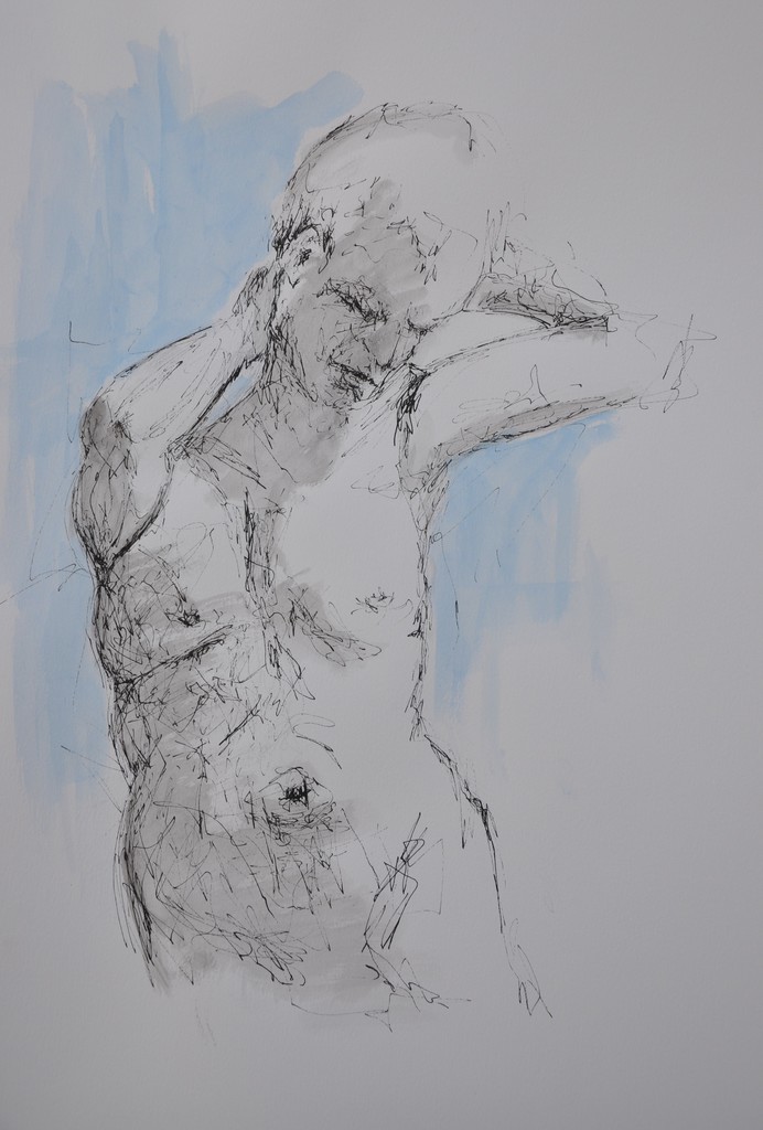 Oostindische inkt met acryl - afbeelding mannelijk torso met de armen achter het hoofd