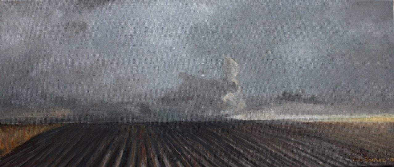 Eindeloos akkerlandschap bij ondergaande zon na een regenbui.