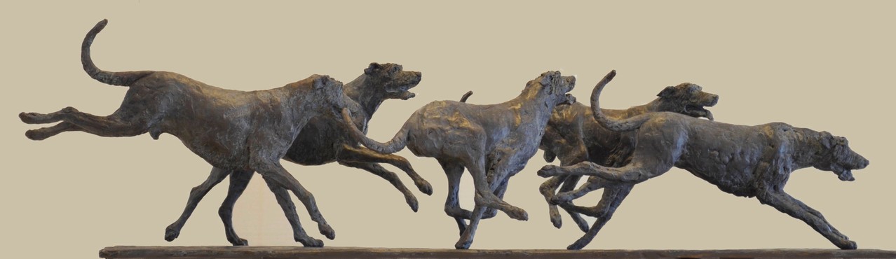 Werk in opdracht en die luidde: 'Een groep van minimaal 5 Ierse Wolfshonden of Deerhounds in actie'. Voor een firma in hondenvoer, Gorredijk. Werk staat in de Hortus van Haren. Eigen exemplaar, beschikbaar, gieting 1 E.A.
