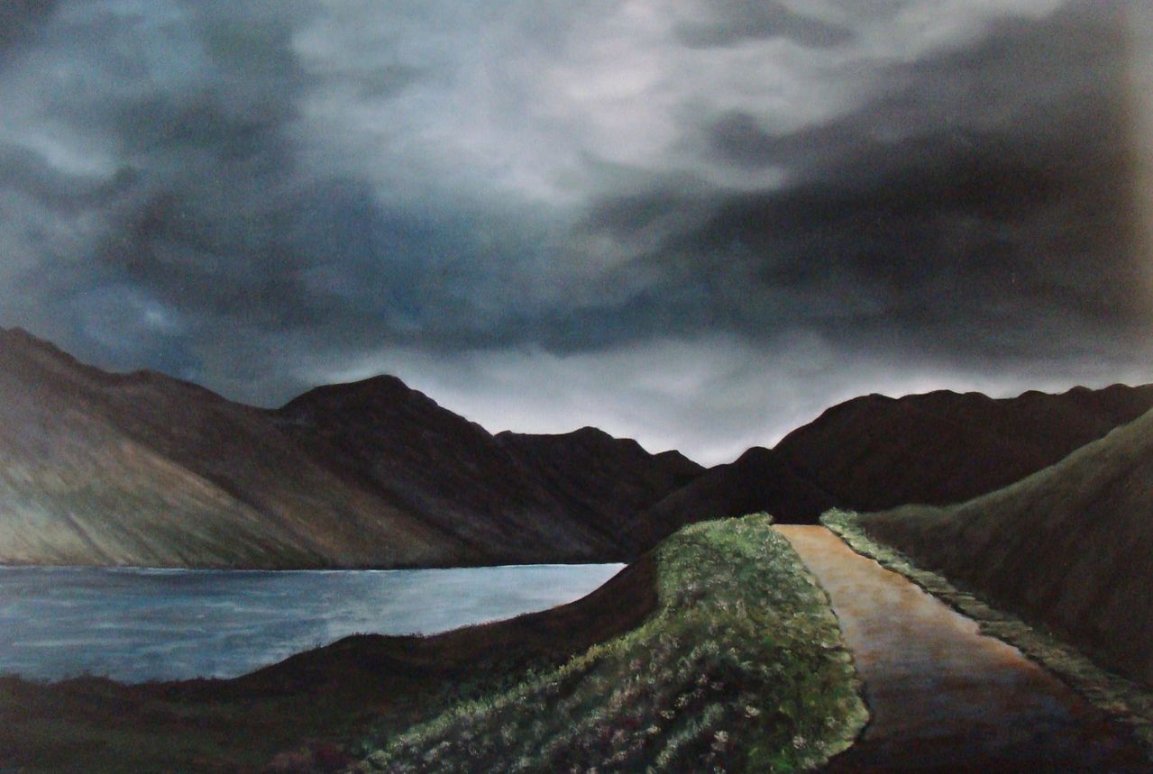 Loch Lochny verborgen tussen de bergen Donkere wolken die de zon verbergen Eenzaam slechts de natuur als metgezel Een beetje licht achter de bergen is er wel