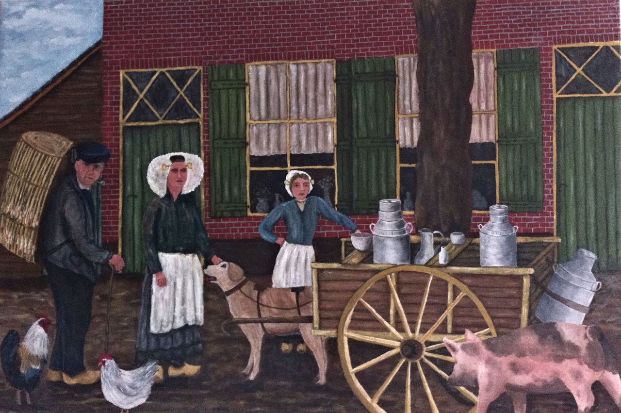 Naar de markt met kippen in de mand Een pijp in de mond een stok in de hand De hond kijkt het vrouwtje treurig aan Komt er nog meer melk op de kar te staan