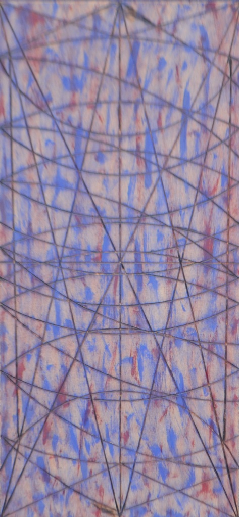 Dit schilderij heet 'Opschudding' omdat tijdens het tekenen de lijnen met elkaar conflicteerden vanwege een fout van mij. Lakverf op MDF