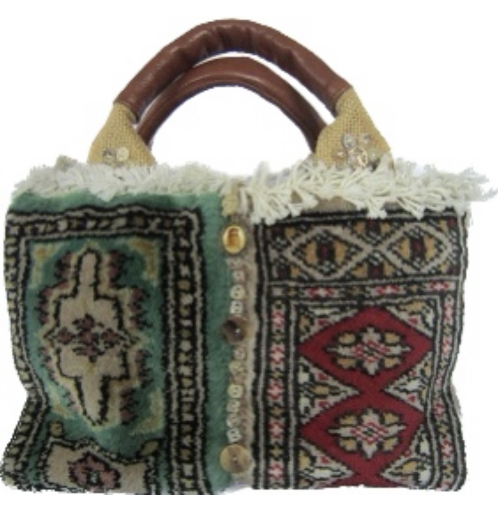 drie kleine Persische tapijtjes, aan elkaar gezet en verstevigd met jute, versierd met parelmoeren knopen