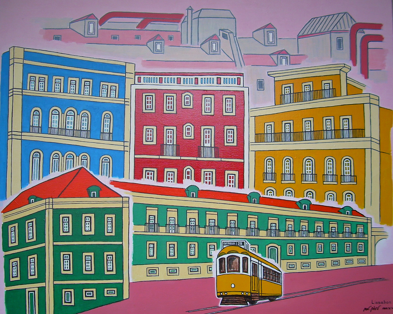 Mijn schilderijen bestaan uit gebouwen en mensen.