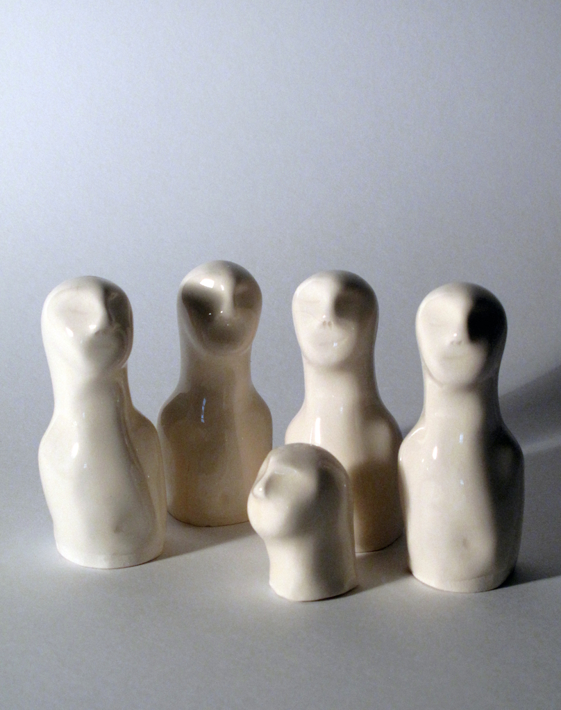Gegoten vorm gemaakt m.b.v. zelfgemaakte mallen. Bestaat uit 5 losse figuren Gietklei, onderglazuurpotlood en glazuur afmetingen is per figuurtje (behalve kleine kopje)