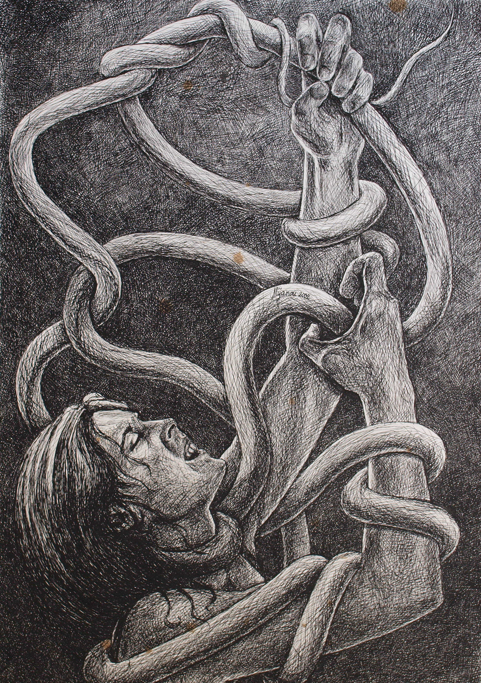 Een hopenloos gevecht met de verstikkende werkelijkheid. A hopeless fight with the suffogating reality