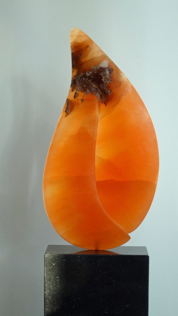 Toen ik deze steen van oranje seleniet zag liggen, dacht ik dat kan meer één ding worden: een vlam. Vanwege de intensiteit van de licht doorschijnende oranje kleur, past allen een temperamentvolle titel bij dit beeld: ¡Fuego! In de top van de steen zat een vervuilde laag die het beeld extra karakter geeft. De illusie van verbranding. Op een sokkel van Iers hardsteen.