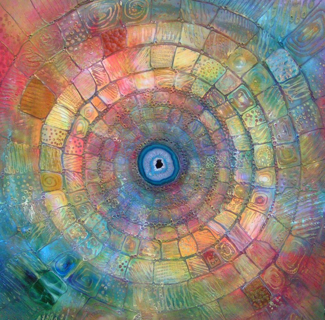 Het begrip ‘tijd’ is niet te vangen. We zoeken in terugkerende patronen en structuren, het blijft relatief. En voor ons gevoel oneindig. Acryl, zand en glas (agaatschijf) op linnen