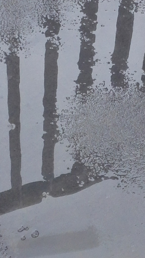 Schaduw op het asfalt van een hek, er ligt water op het asfalt, omdat het beschadigd is en er een kuil in het asfalt zit. Een vreemd beeld is ontstaan. Deze afbeelding maakt deel uit van een serie. In de serie is dit no. 2. De serie bestaat uit 12 werken vanuit het midden ontstaat er een spiegeling. Links en rechts van de serie zijn gespiegeld, waardoor er een herhaling ontstaat. Dit geeft een interessante wending aan deze serie.