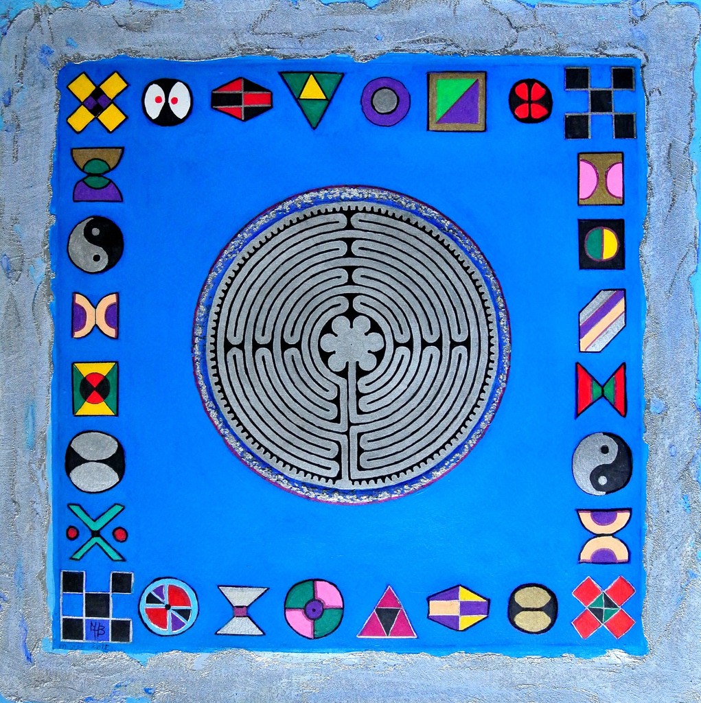 De levensweg van het Chartres-labyrint, omgeven door spirituele symbolen. Acryl op doek met gemengde techniek.