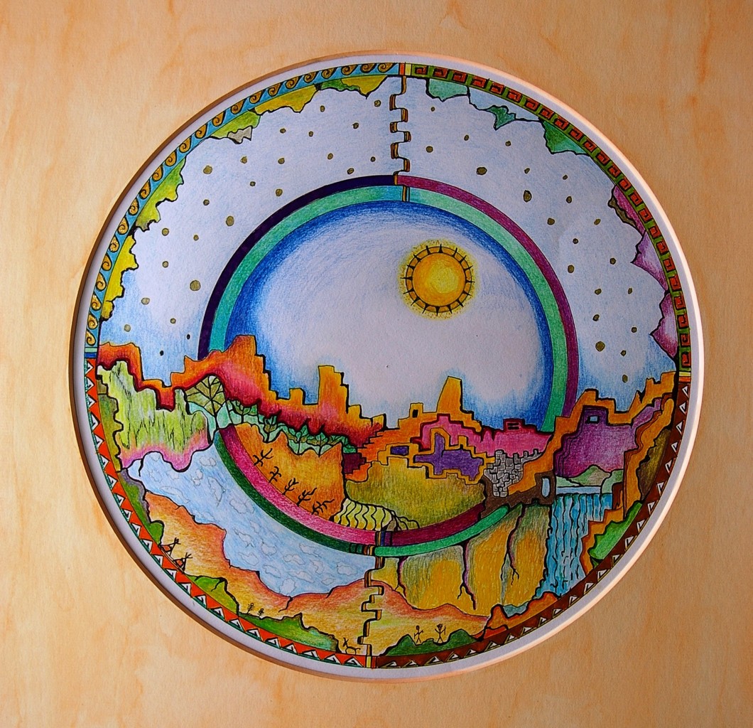 Meditatieve, symbolische kunst en bijzondere mandala's. Verrassende, kleurrijke tekeningen en schilderijen in acryl en zandpasta.