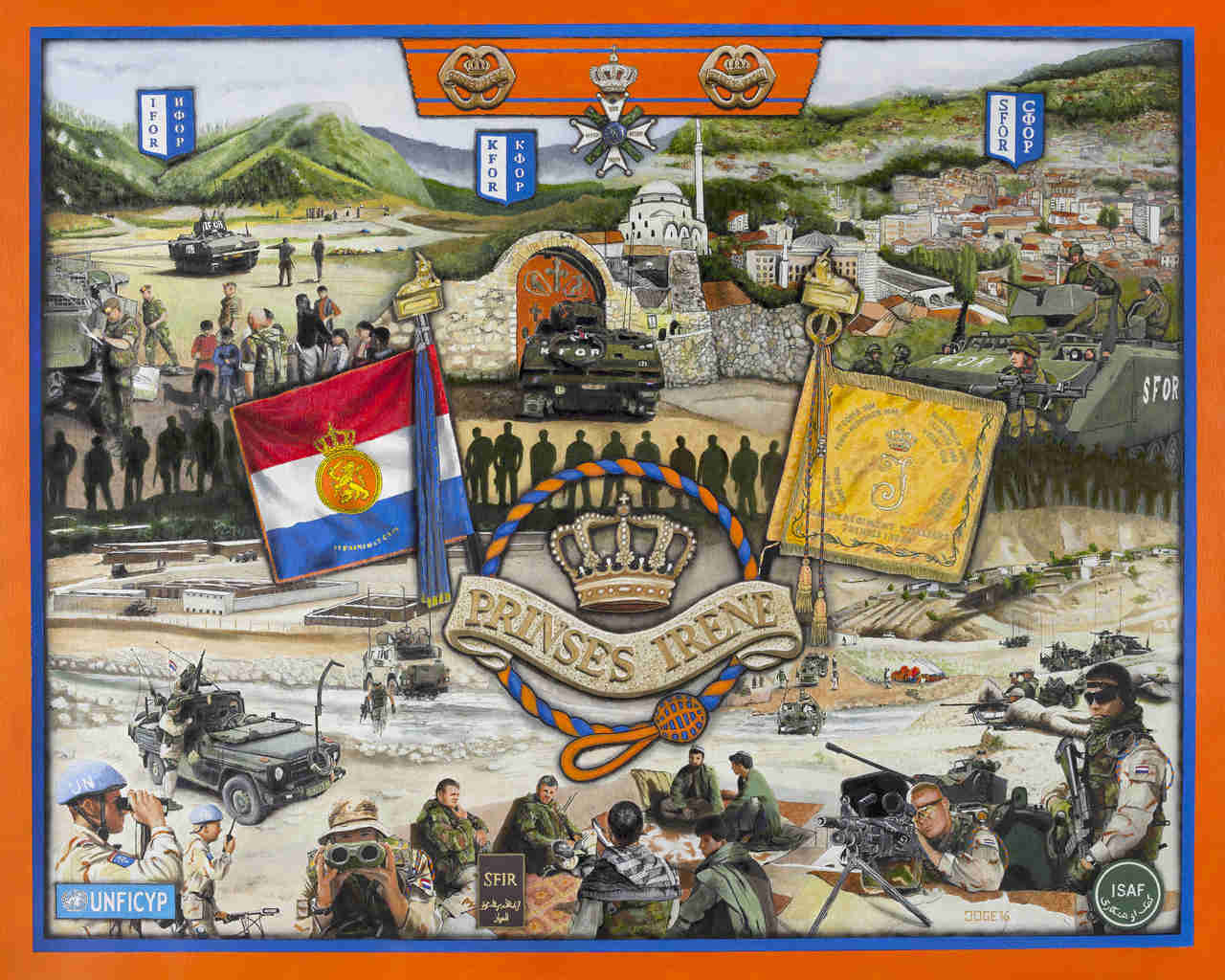 Een door de veteranenvereniging aangeboden schilderij ter gelegenheid van het 75 jarig bestaan van het Garderegiment Fuseliers Prinses Irene. De oranje blauwe omlijsting hoort bij het schilderij.