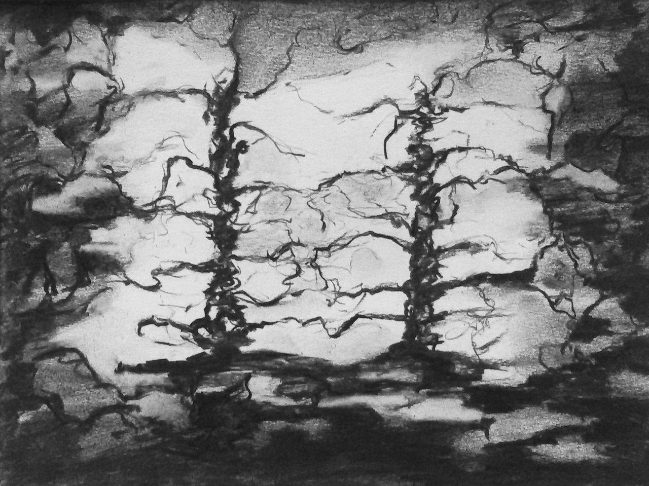 houtskool van div bomen uit de serie: 'de weg ontstaat al gaande'