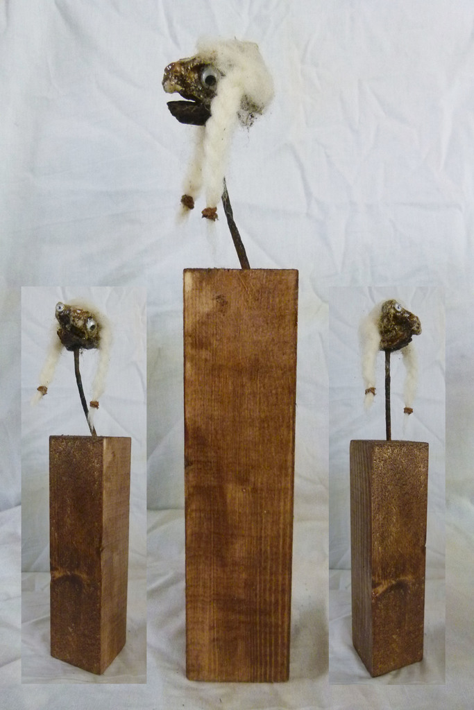 Gemaakt van hout, steen, wol en roestige spijkers.