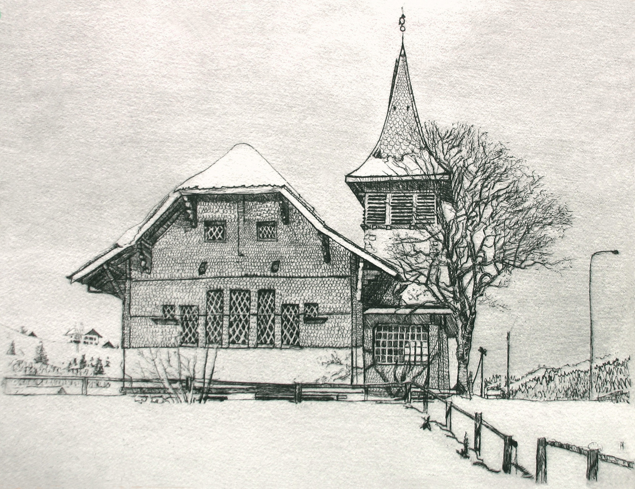 Kerk Church Ets Sneew Etching Snow Zwitserland Swiss Vaud Les-mosses