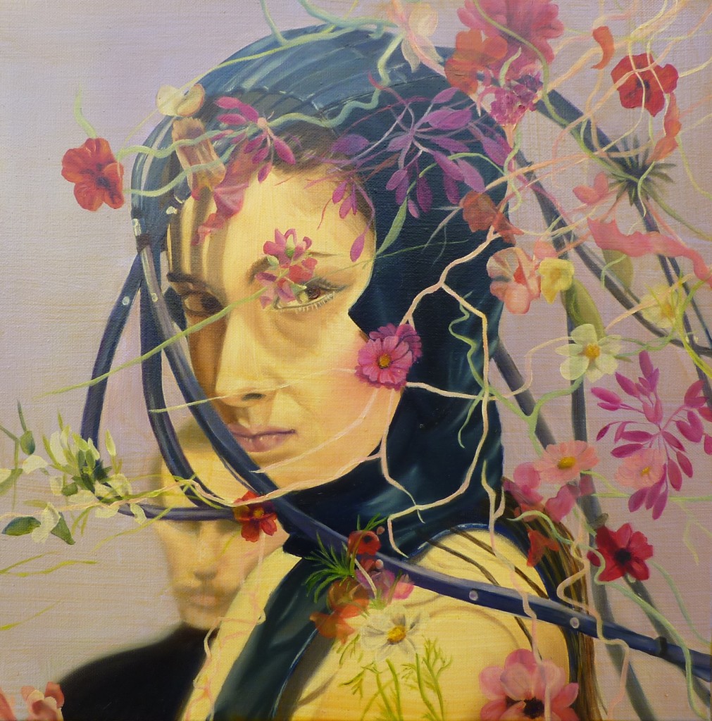 Een schilderij uit meerdere lagen opgebouwd; Een man, vaag in de achtergrond Een vrouw, mysterieus gekleed Bloemen en takken verspreid over het beeld Gevangen in een transparante glaceerlaag.