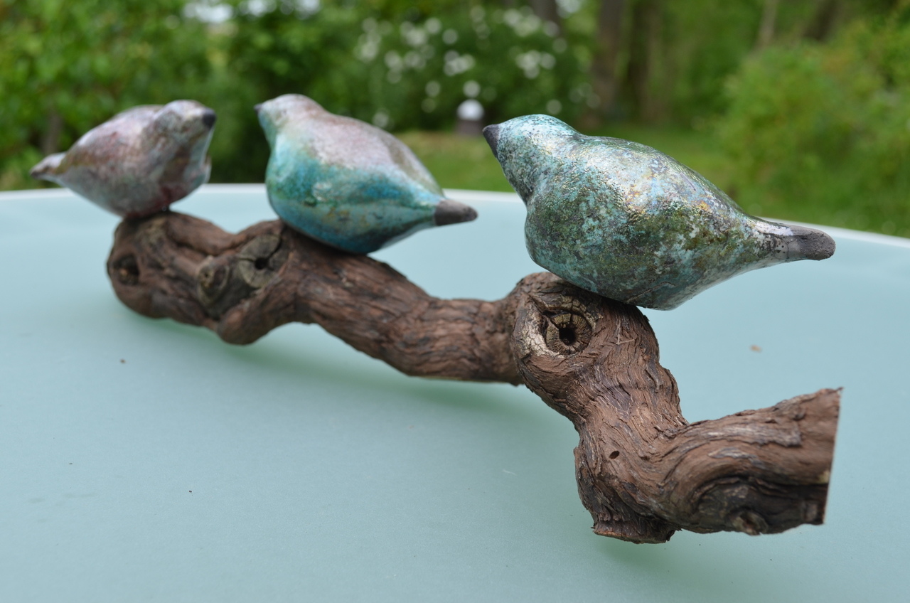 Drie kleine vogeltjes op een wijnrank. Handgevormd en gegelazuurd met tourquoise glazuur. Raku gestookt.