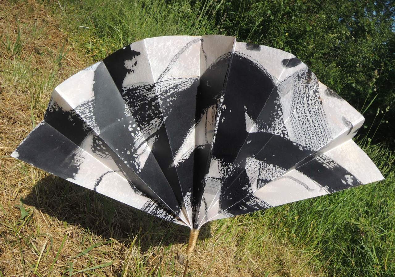De grote waaiers : Papier behandeld met lijnolie beschilderd met inkten en acrylverf. Tweezijdig. Les grands éventails: Papier traité avec de l'huile de lin, peint avec de l'encre et de la peinture acrylique . . Deux faces The big fans: Paper treated with linseed oil painted with ink and acrylic paint. Double sided Los gran rangos: Papel tratado con aceite de lino pintada con tinta y pintura acrílica. Dúplex