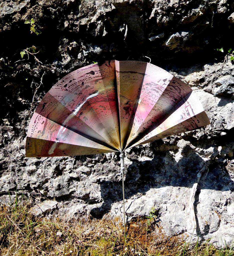 De grote waaiers : Papier behandeld met lijnolie beschilderd met inkten en acrylverf. Tweezijdig. Les grands éventails: Papier traité avec de l'huile de lin, peint avec de l'encre et de la peinture acrylique . . Deux faces The big fans: Paper treated with linseed oil painted with ink and acrylic paint. Double sided Los gran rangos: Papel tratado con aceite de lino pintada con tinta y pintura acrílica. Dúplex