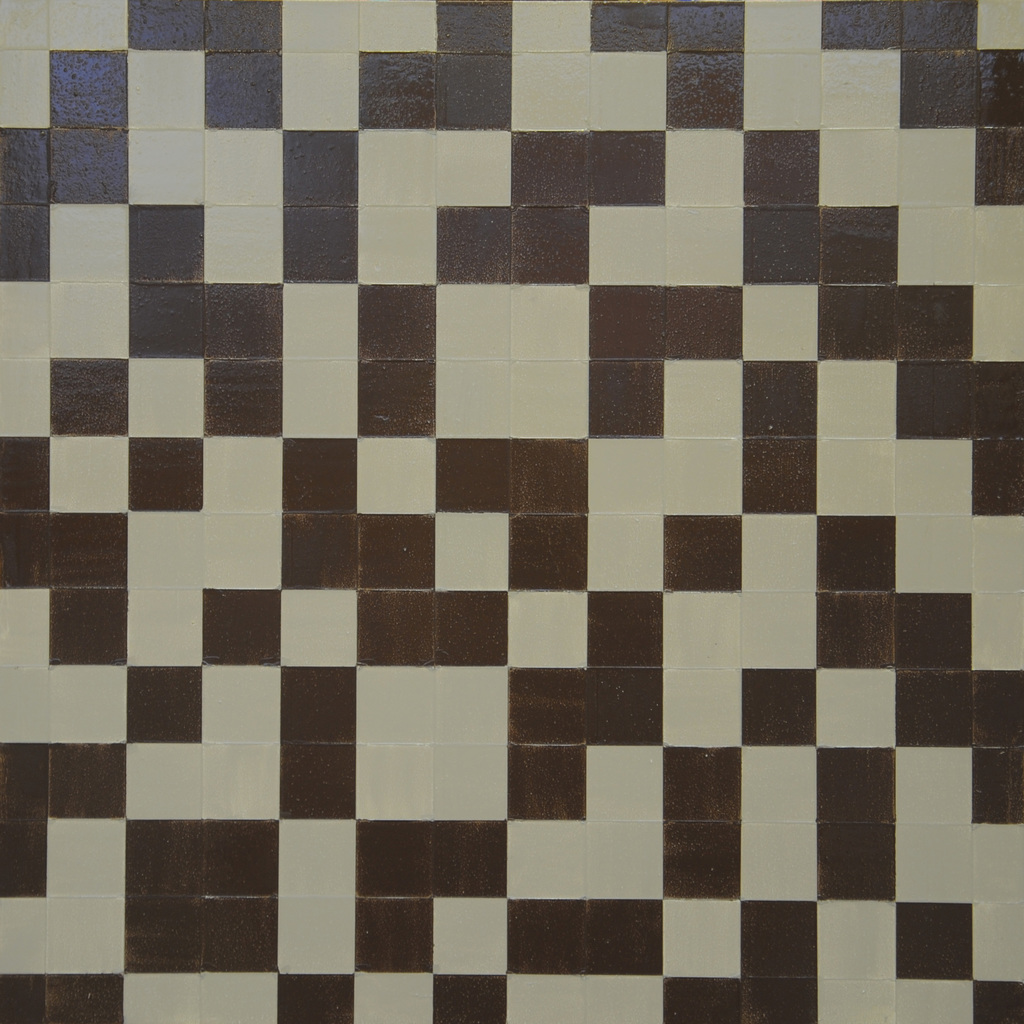 Thema: Chaos (Geometrische Chaos) Mijn kunst is beïnvloedt door de moderne wiskundige en wetenschappelijke benadering van het begrip complexe orde van de natuur. Met name heb ik me verdiept in de Chaos theorie en de fractal geometrie. Ik ben geen wiskundige, en ik gebruik geen wiskundige formules. De ideeën van de Chaos theorie en fractal geometrie leiden tot de ontwikkeling van de composities in mijn werk. Ik gebruik driehoeken,vierkanten en cirkels in mijn schilderijen, maar in mijn huidige serie, geoChao richt ik me alleen op de vierkanten en de verhoudingen tussen de vierkanten. Ik ontwikkel mijn composities door kleine vierkantjes op grote te zetten of grote op kleine te zetten. Het gaat om de onderlinge verhoudingen tussen de vierkanten. Ik laat de methode die ik kies de compositi