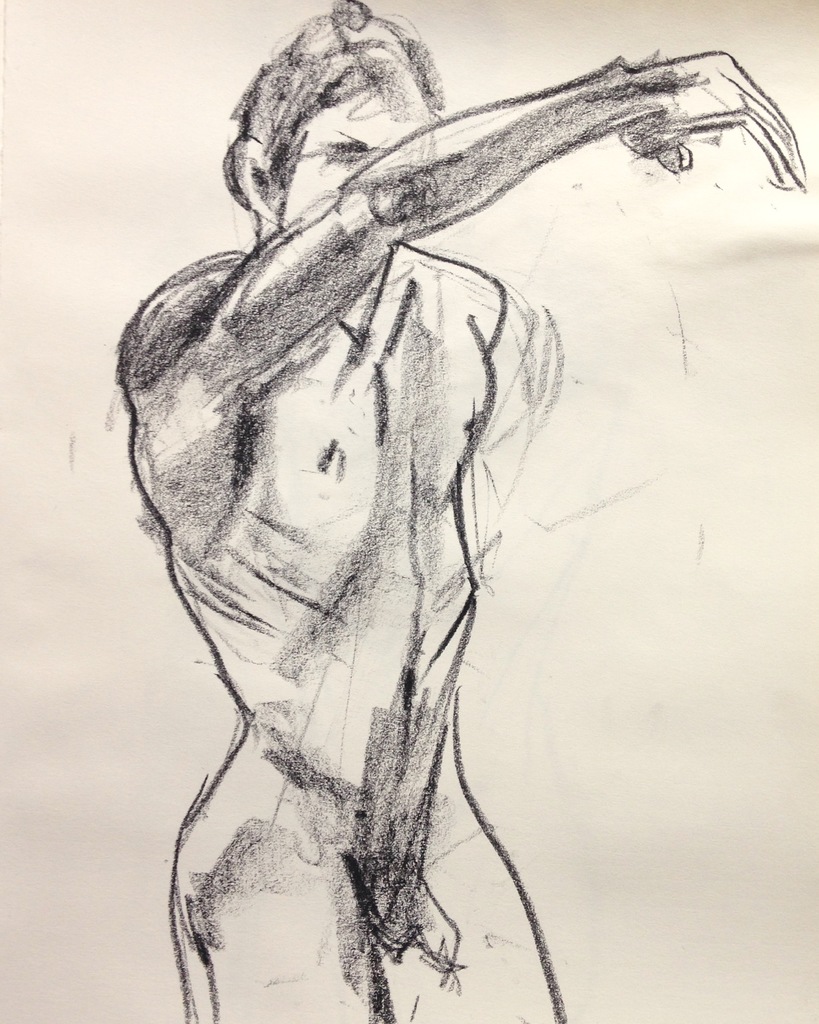 Staand mannelijk jong model met opgeheven arm. Syberisch krijt op papier.