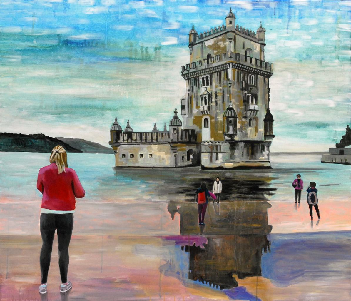 Dit schilderij stelt El torre de Bèlem voor in Lissabon. De inspiratie voor dit werk kreeg in tijdens een reis in Lissabon. Het viel me op dat telkens vrouwen zich lieten fotograferen voor deze toren, de toeristische attractie bij uitstek daar. Je ziet dikwijs single vrouwen die samen op reis gaan of iets gaan eten in een restaurant of een of andere uitstap maken. En elkaar dan fotograferen of selfies maken. Toch werd ik aangesproken door de eenzaamheid die ik op de foto's, die ik ter plaatse maakte, terugvond bij deze vrouwen, ondanks het samen zijn in groep. Zeer zelden zie je mannen die samen iets dergelijks ondernemen. Eerder zouden mannen dit dan alleen doen als ze geen partner hadden, maar dan zouden ze geen foto's van zichzelf maken, eerder van de omgeving. Het liet me nadenken over de verschillen in gender en hoe onze samenleving en ons onderwijs nu toch meer neigt naar het vrouwelijke, door allerhande zaken zoals co working, in een kring zitten en het over gevoelens hebben, en dergelijke op te leggen ook aan mannen. Maar ik wijk af, ;) En over de toeristische sector en hoe de laatste jaren bepaalde monumenten verworden zijn tot selfie attracties. En anderzijds er bepaalde kunstwerken gecreëerd worden die tot doel hebben dat mensen zich ervoor laten fotograferen. Voor dit werk liet ik me dus inspireren door foto's die ik ter plaatste maakte. Vervolgens heb ik met acrylverf enkele experimentele technieken toegepast om de structuur van de toren, de water en de lucht levendig te krijgen.