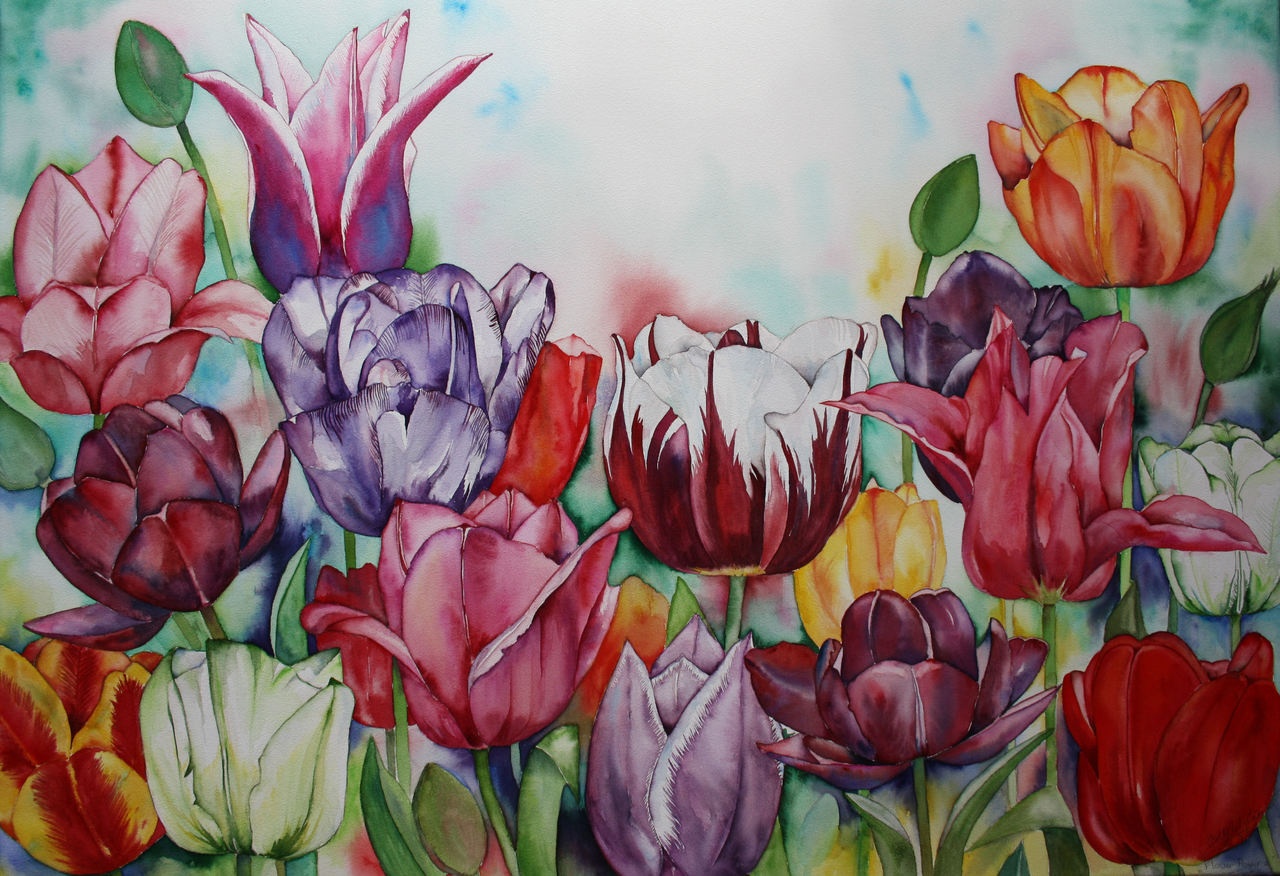 Flower power, een vrolijk schilderij van allemaal soorten tulpen in een groot formaat. Felle heldere kleuren die op elke wand tot zijn recht komen. Aquarel door een speciale techniek op doek geschilderd.