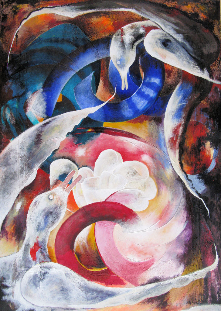 Uit oud werk, intuitief vorm gegeven vanuit wat bleef hangen uit het regionale nieuws, niet bewust maar het onstond.Zwanen die in het groene hart uit de lucht geschoten werden.Beetje schokkend ook.Verweven in het bestaande onstond er een nieuwe voorstelling van dat gene bleef beklijven.
