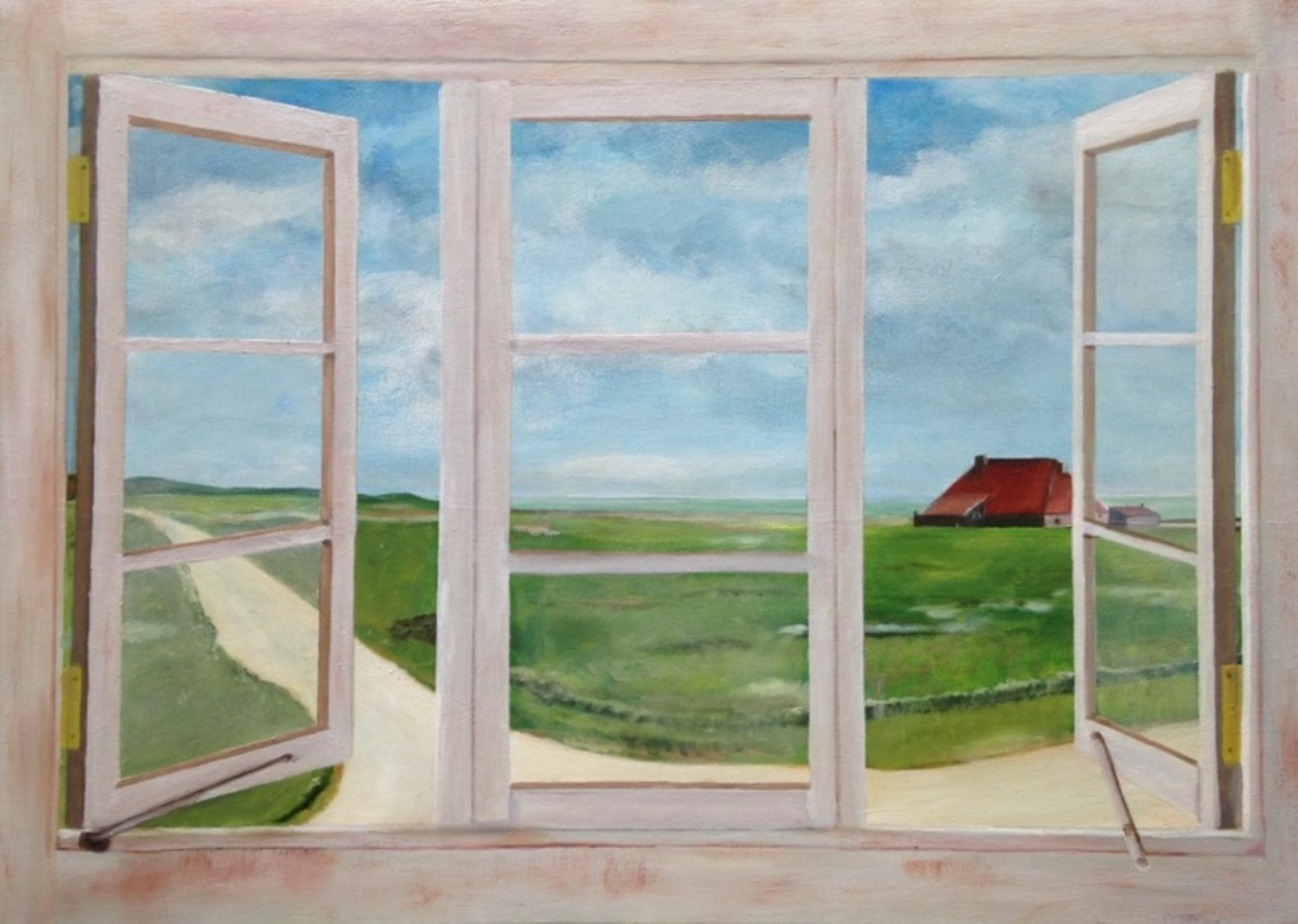 Zicht op boerderij aan zee in Terschelling door een (fictief) raam. Landschap in Arcyl, boerderij en raam in Olieverf.