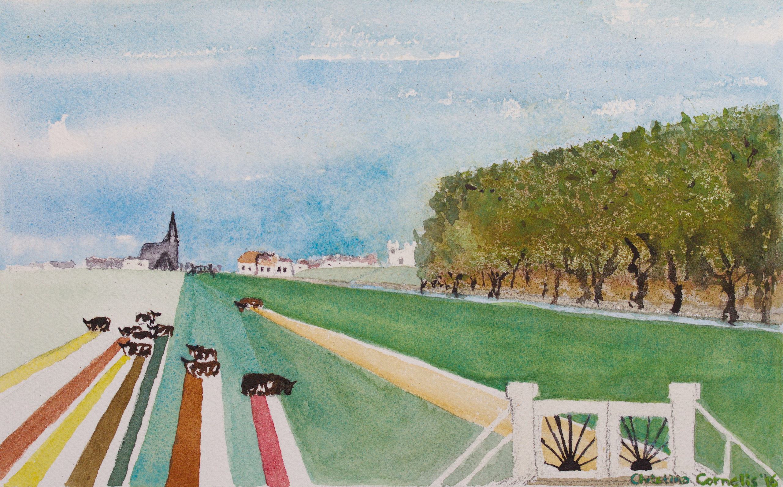 Aquarel Koeien Cows Kerk Hek Church Veld Pad Gate Watercolour Field Lane