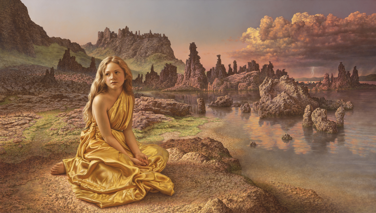 Meisje Zee Geel Yellow Vrouw Woman Girl Blond Landscape Realism Fantasie Rotsen Fijnschilderen Fantasy Sea Blonde Fineart Mythe Myth Rocks Bliksem Lightning Wolken Clouds Storm