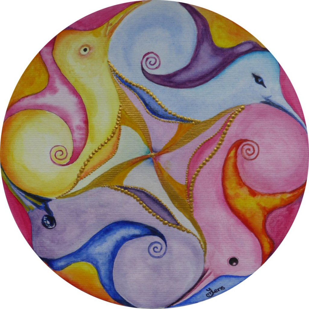 Speelse originele mandala ontstaan vanuit dynamische beweging, de ronde lijnen geven als snel de indruk van vogels of andere fantasiedieren. De aquarel is afgewerkt met een beetje goud acrylverf