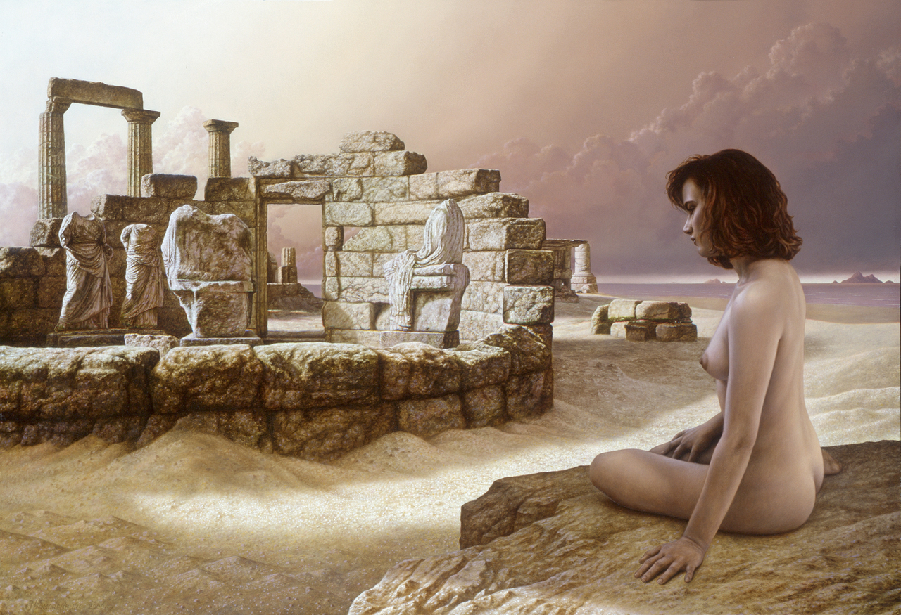 Naakt Nude Woman Vrouw Statue Beeld Desert Woestijn Fineart Fijnschilderen Realism Realisme Surrealisme Clouds Wolken