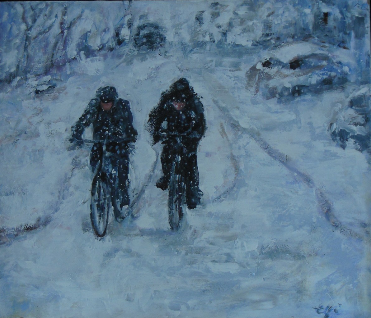 Fietsers in de sneeuwstorm