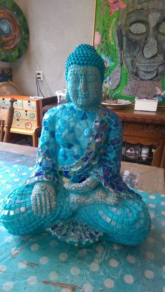 Budha met blauwtinten.Bewerkt met glasmozaiek,keramisch mozaiek en hergebruikt porselein .