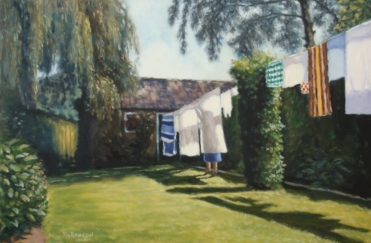 De was Een alledaags tafereel op een zonnige zomerochtend. De was wordt door ons moeder te drogen gehangen in de beslotenheid van de achtertuin. Ze moet zich strekken naar de waslijn om de knijpers vast te kunnen zetten. De grote treurwilg, het schuurtje, de haag van klimop en de berk bij de buren omzomen de tuin en geven een intiem inkijkje in de achtertuin van ons ouderlijk huis.
