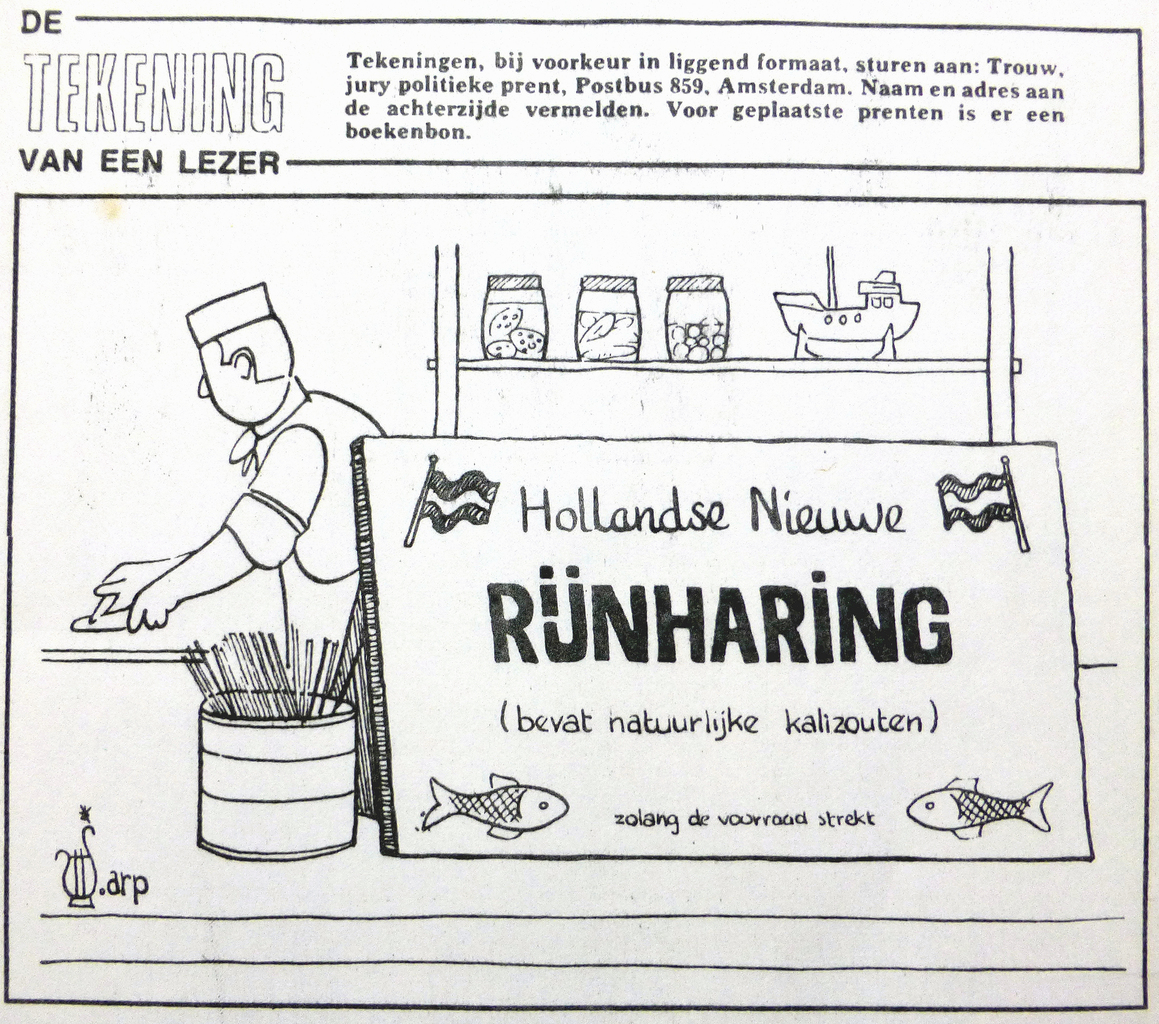 Dagblad Trouw heeft van 1976-1982 de lezer uitgenodigd politieke tekeningen in te sturen voor de rubriek "De Tekening van een Lezer". Elke dag werd een keuze gemaakt uit de beste ingezonden tekening onder het motto " Raak is belangrijker dan goed" Toelichting prent: Protest in Europa en met name van Nederland tegen plannen van Frankrijk om kalizouten rechtstreeks te lozen op de Rijn (o.a. schade voor tuinders in het Westland). Geplaatst op 10-4-1976, mijn eerste politieke prent.....