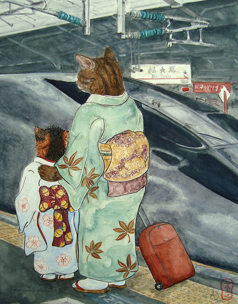Japan Aquarel Kimono Trein Kat Cat Train Watercolour
