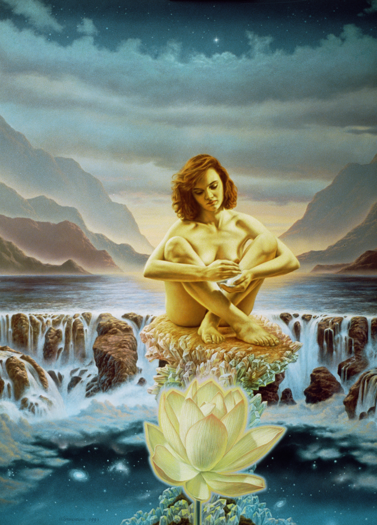 Nude Naakt Universe Cosmos Waterfall Waterval Woman Vrouw Crystals Kristallen Fineart Fijnschilderen Olieverf Realisme Meditatie Meditation Yoga Mudra Zen Spiritueel Spiritual