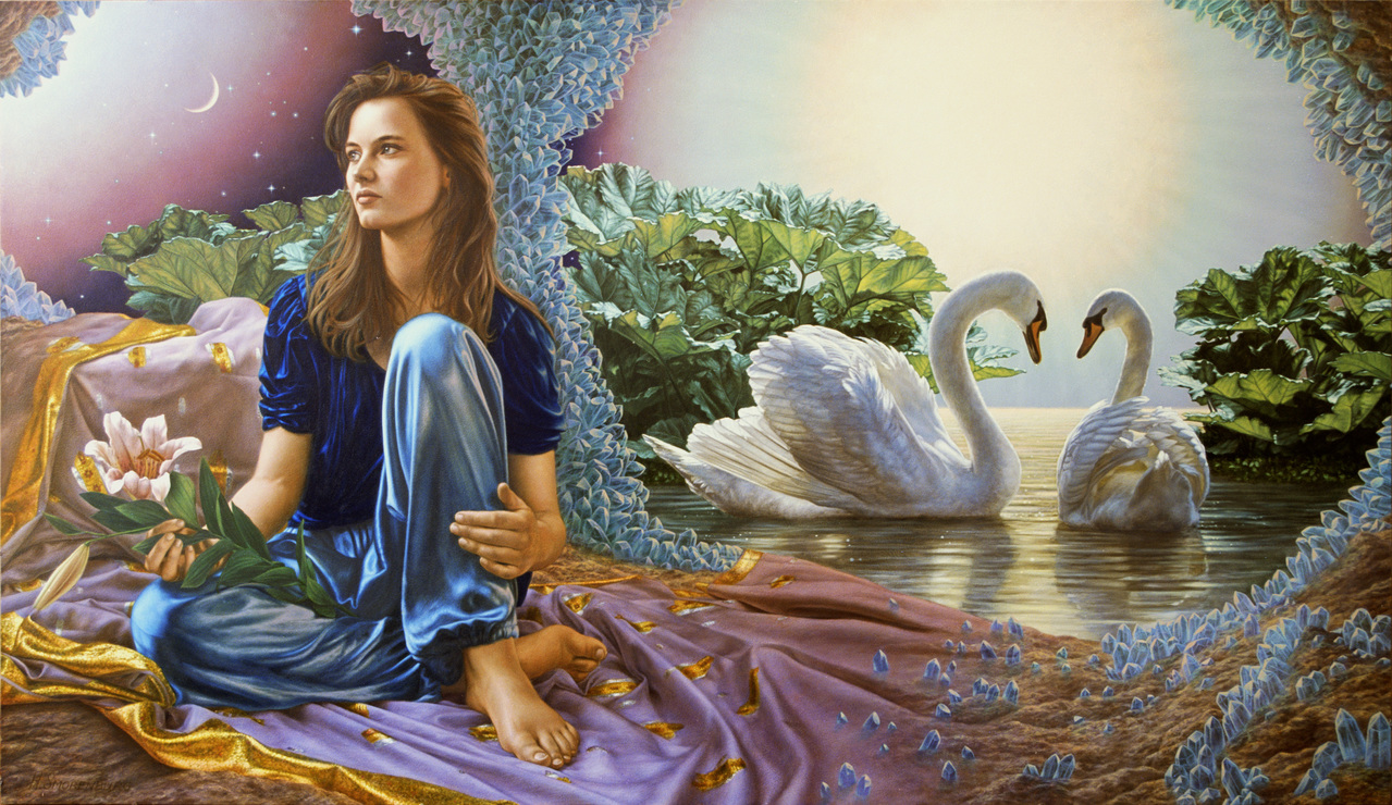 Romantiek Vrouw Zwanen Maan Woman Bladeren Leaves Realisme Realism Moon Kristallen Droom Sterren Romantic Stars Dream Swans Crystals Girl Meisje