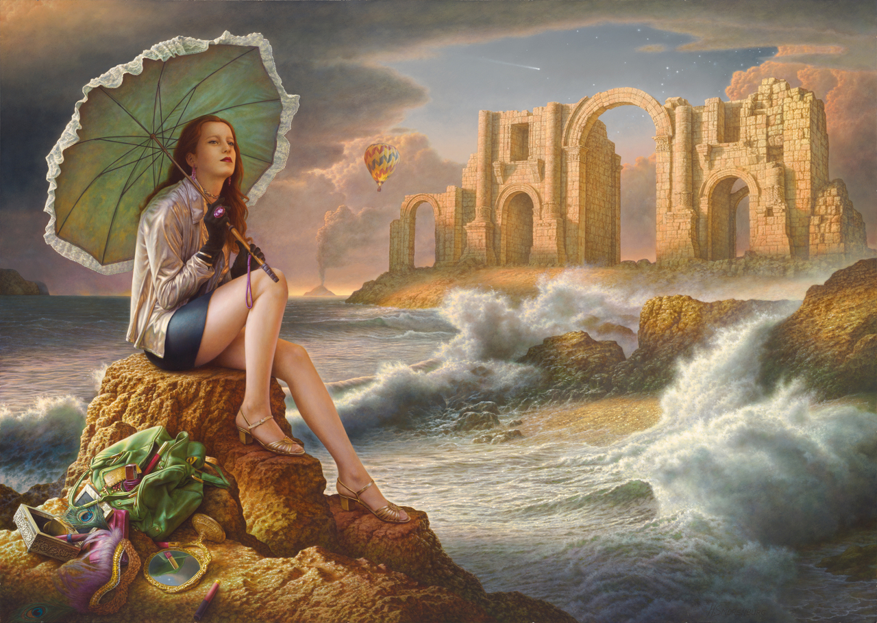 Girl Meisje Ruïne Ruin Waves Golven Luchtballon Balloon Make-up Spiegel Mirror Storm Licht Sterren Stars Parasol Umbrella Surreëel Surrealism Surrealisme