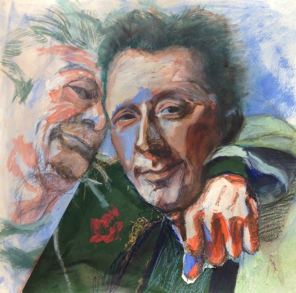 Portret broer met vriend. Olieverf, oliepastel, grafiet, acryl en inktense op Steinbach papier ,